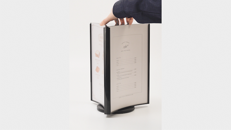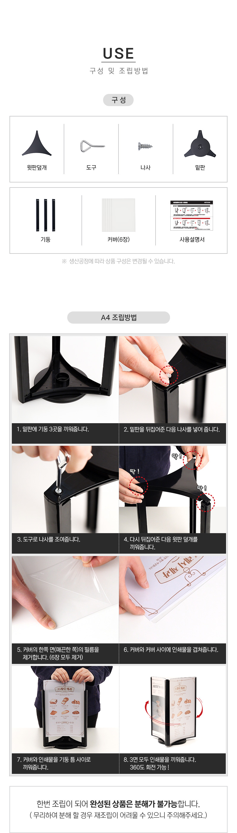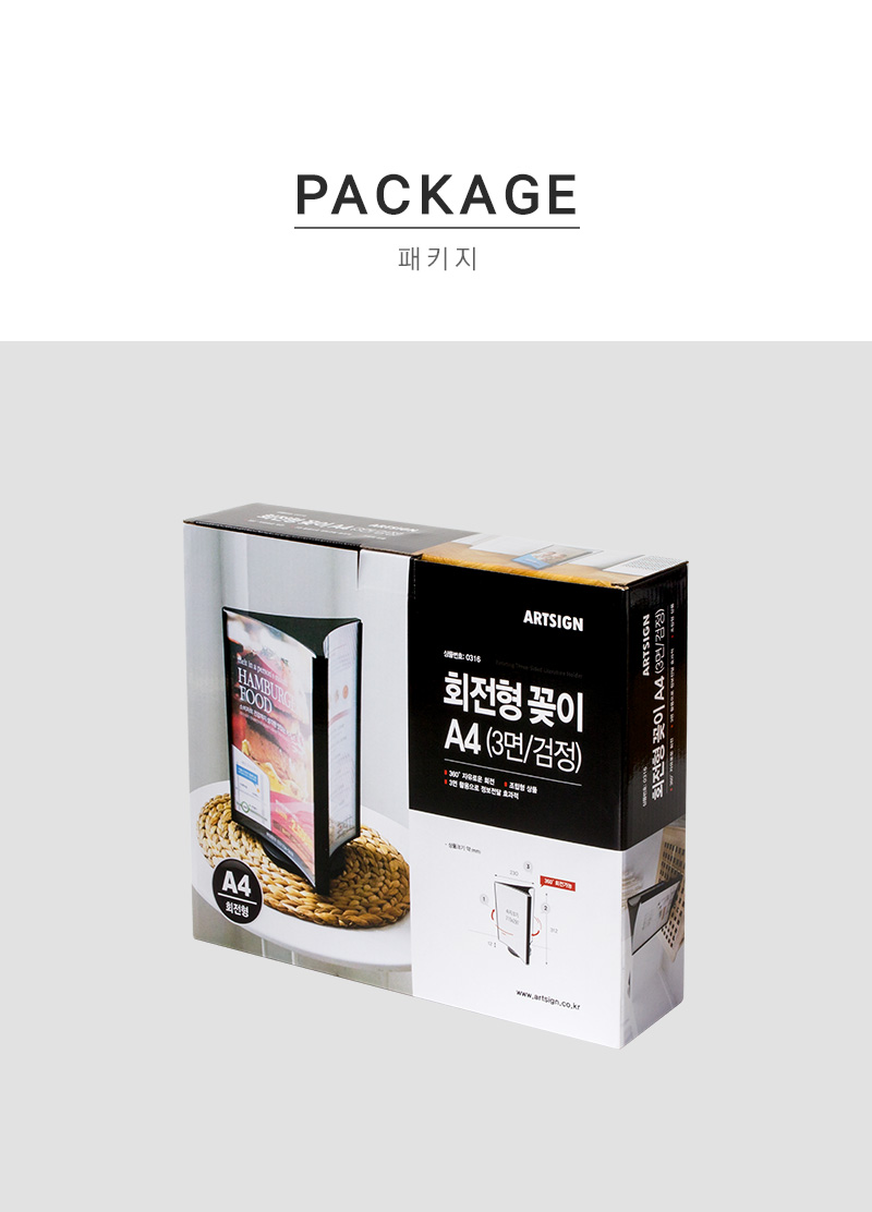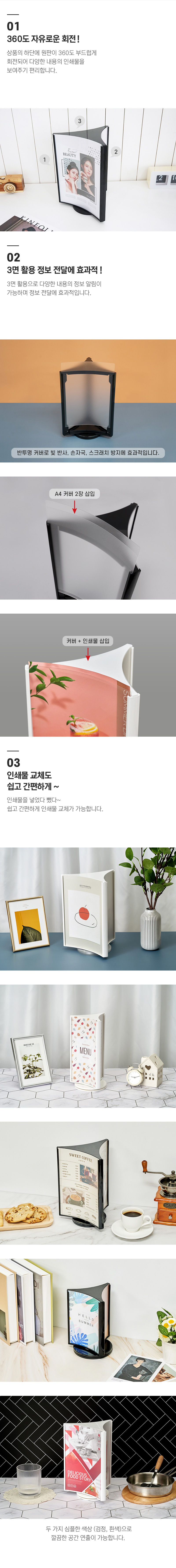 · 사용방법: 원하는 장소에 놓고 A4 크기의 인쇄물을 3면에 삽입하여 사용하세요.