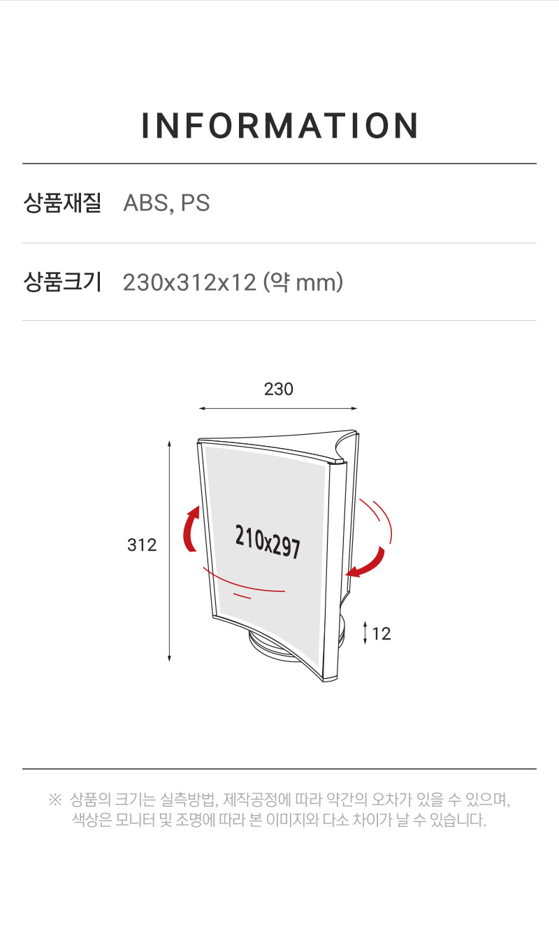 상품크기 외경: 약 230x312x12 (mm) 가로x세로x밑판높이