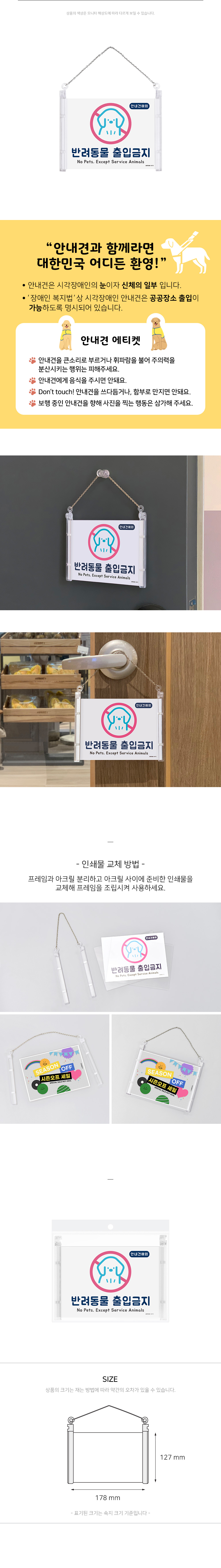 ‘ 반려동물출입금지 ’ 라는 문구가 필요한 상점에 사용하는 걸이형 안내 표지판입니다.
