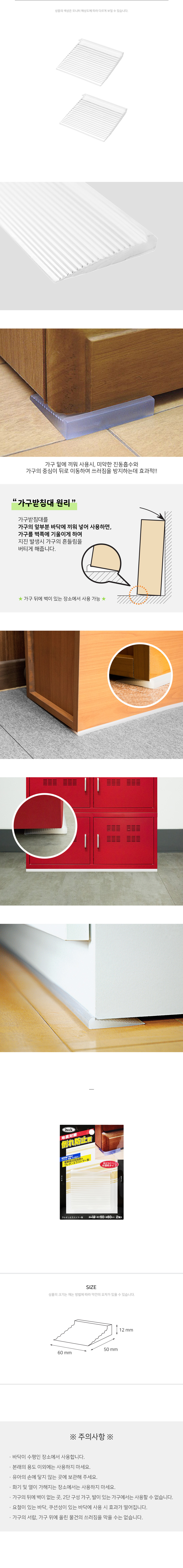 사용방법: 가구 앞부분 바닥에 가구받침대를 끼워넣어 가구를 벽쪽으로 기울이게 하여 사용하세요.