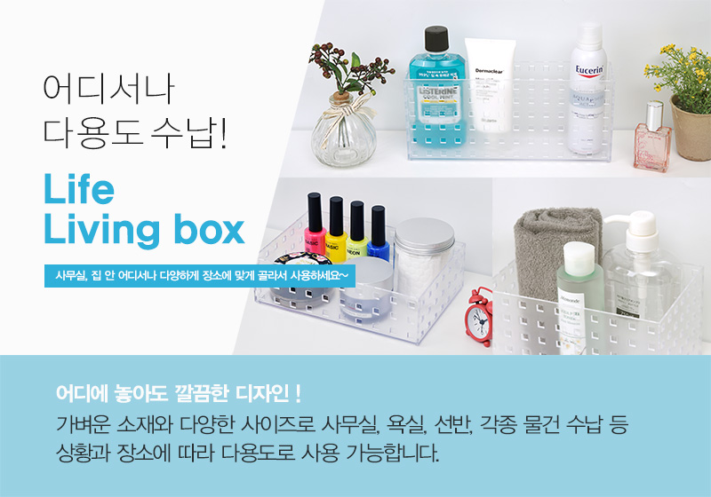 사각수납함은 사무실, 욕실, 선반, 각종 물건 수납 등 다양한 곳에 배치해 집안 곳곳을 깔끔하게 정리할 수 있습니다.