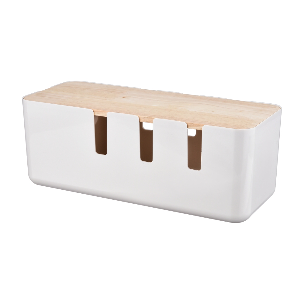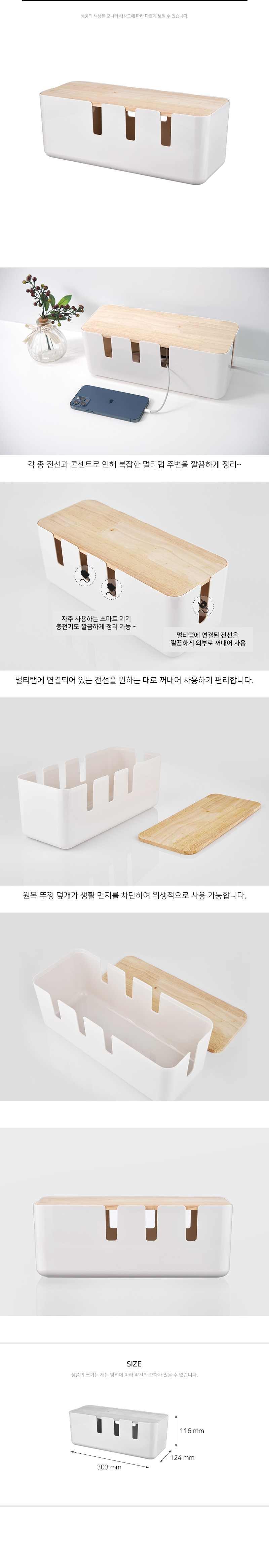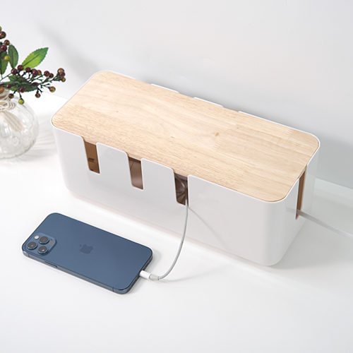 멀티탭을 사용하는 스마트 기기 주변을 깔끔하게 정리할 수 있는 원목 수납함입니다.