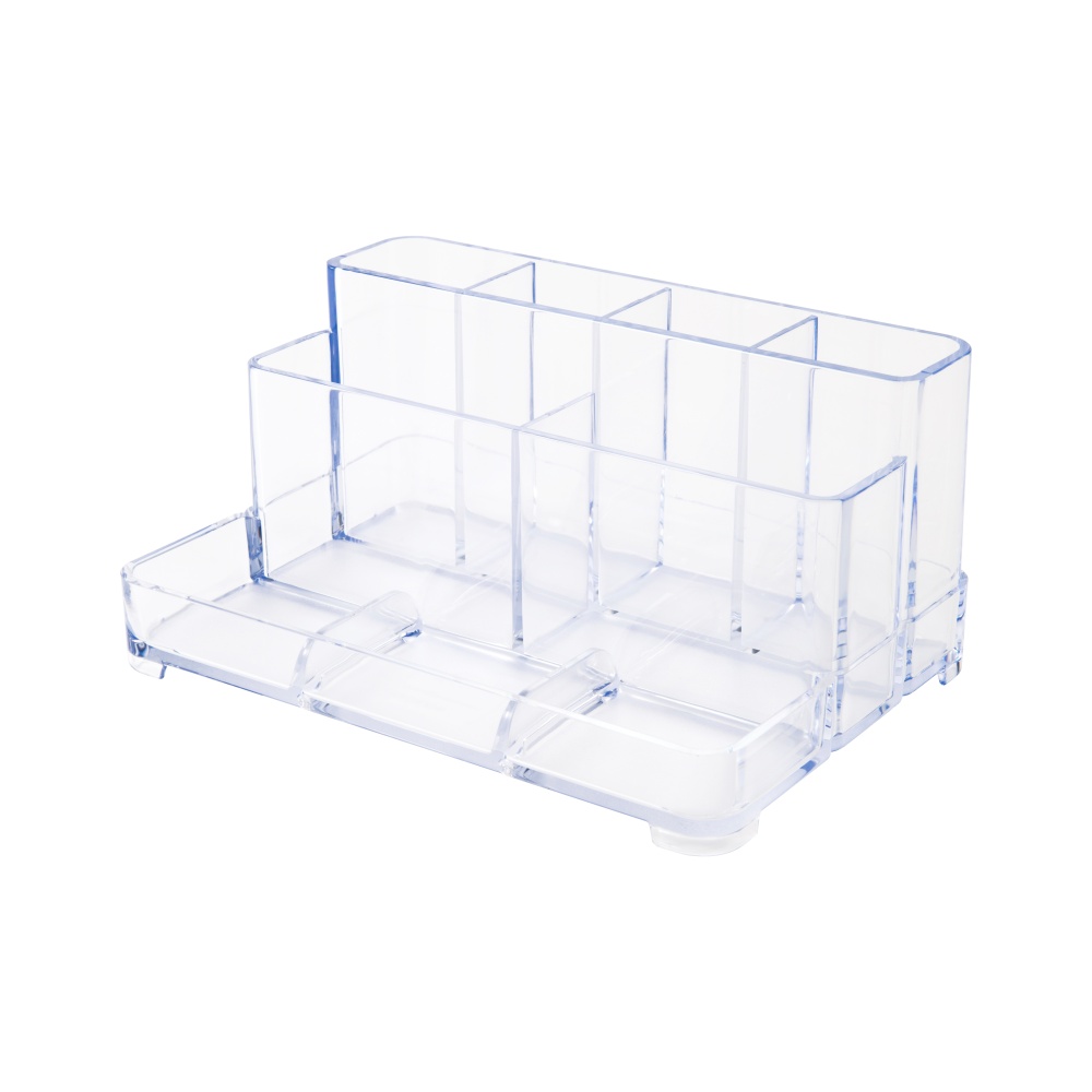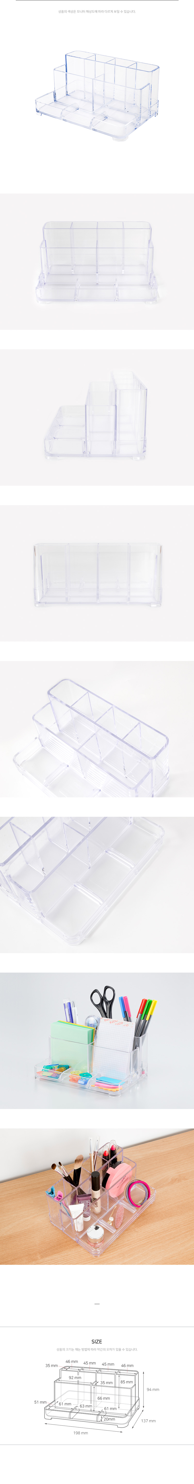 각종 사무용품, 소품 등을 정리할 수 있는 투명 재질의 수납 정리함입니다.