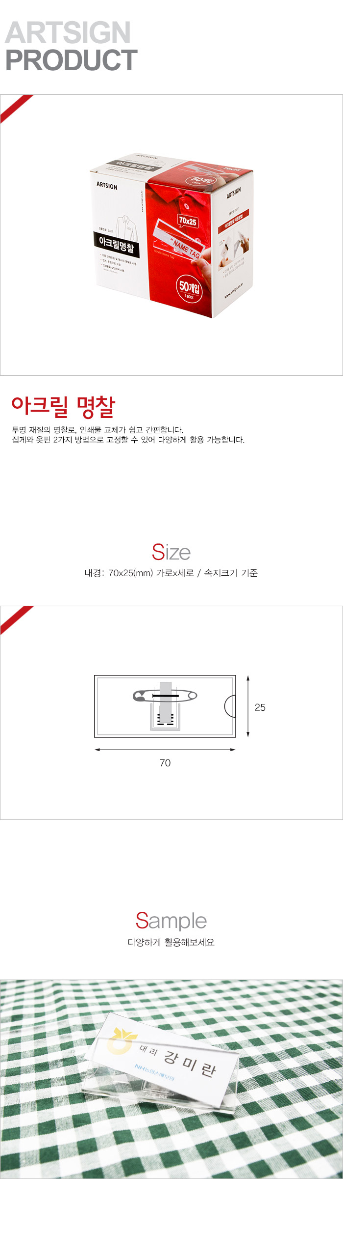 상품크기 70x25 (mm) 가로x세로 / 속지크기 기준