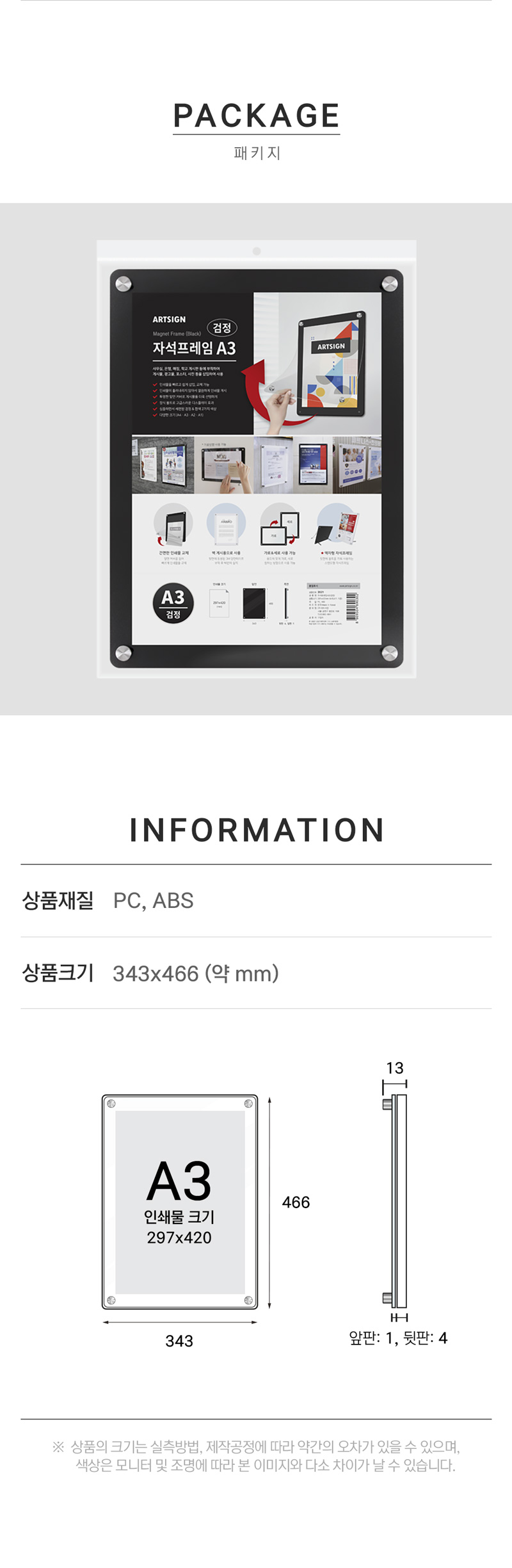 상품크기 외경: 343x466 (mm) 가로x세로, 내경: 297x420 (mm) / 속지크기 기준