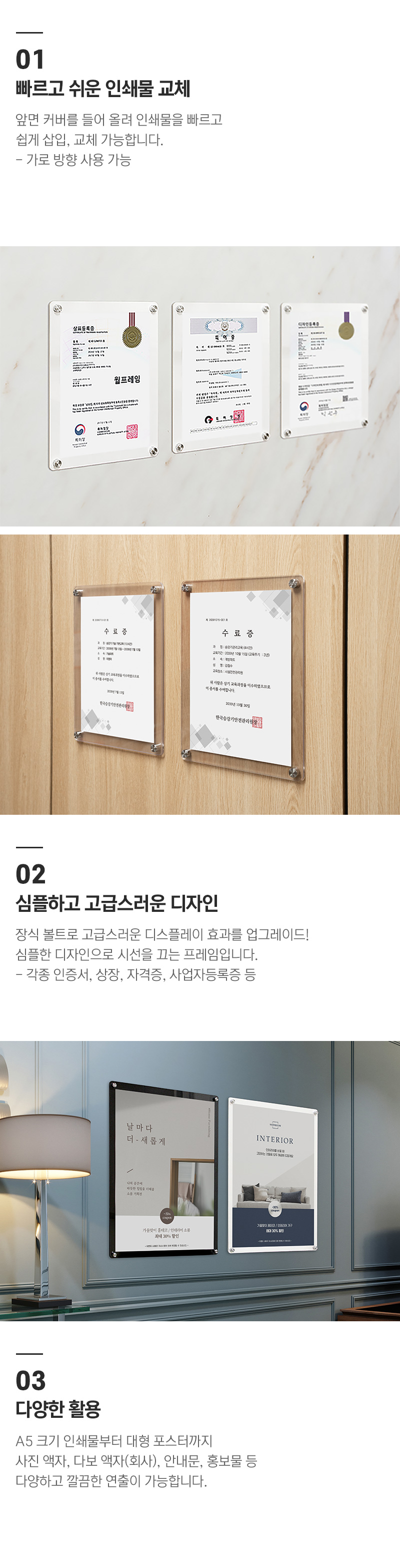 인쇄물을 빠르고 쉽게 삽입, 교체하여 사용하는 자석 프레임입니다.
