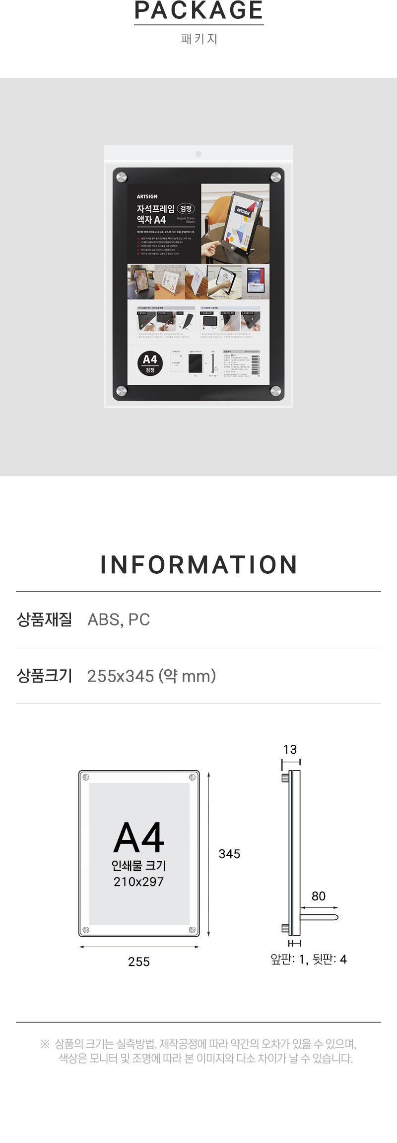 상품크기 외경: 255x345 (mm) 가로x세로, 내경: 210x297 (mm) / 속지크기 기준