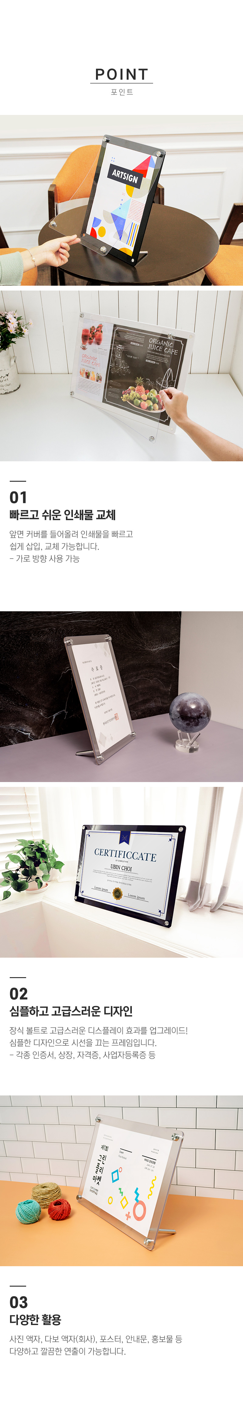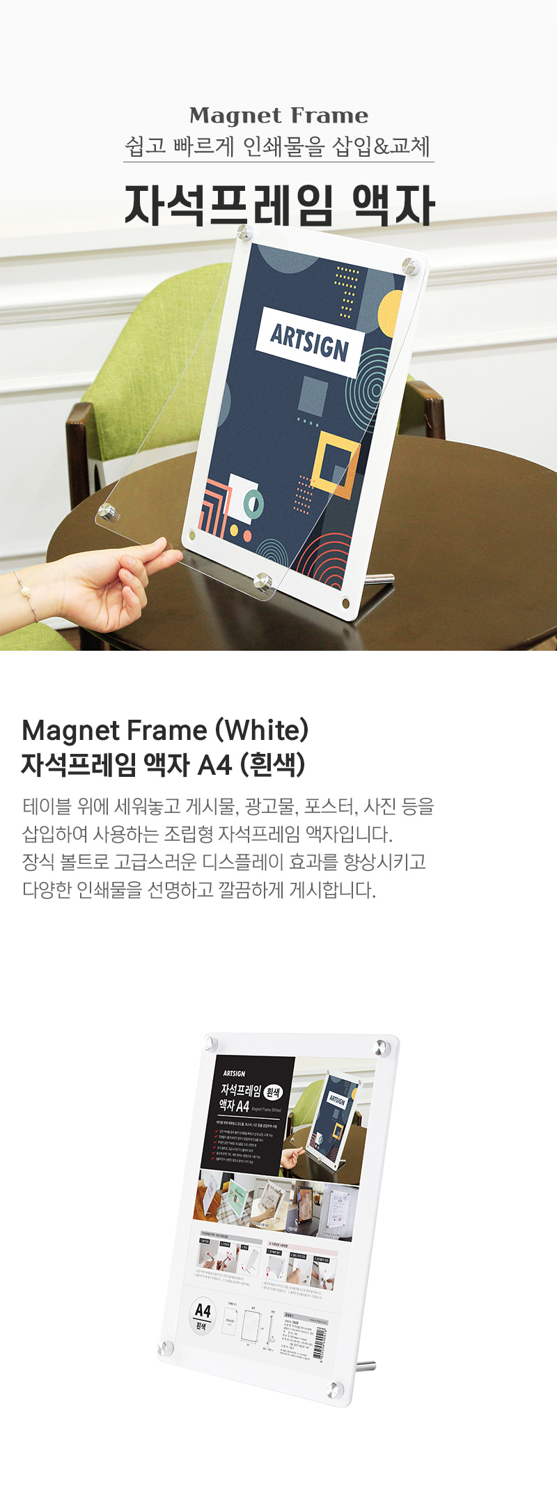 쉽고 빠르게 인쇄물 삽입, 교체가 가능하고 깔끔하게 게시할 수 있습니다.