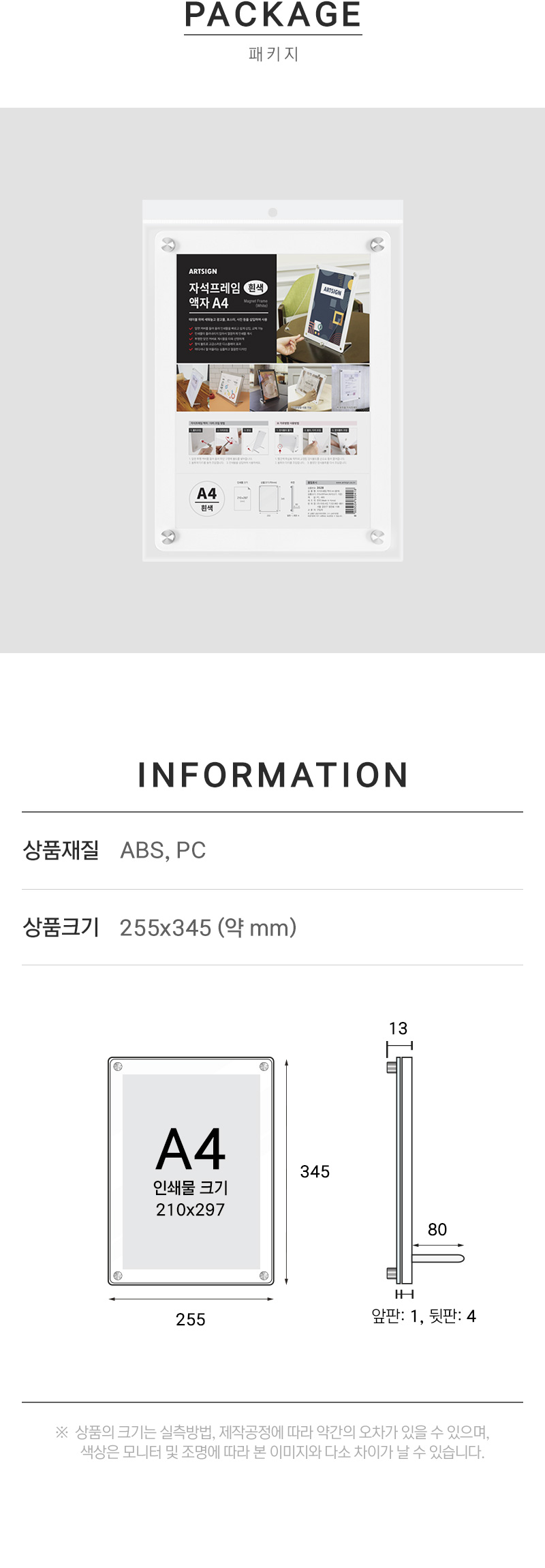상품크기 외경: 255x345 (mm) 가로x세로, 내경: 210x297 (mm) / 속지크기 기준
