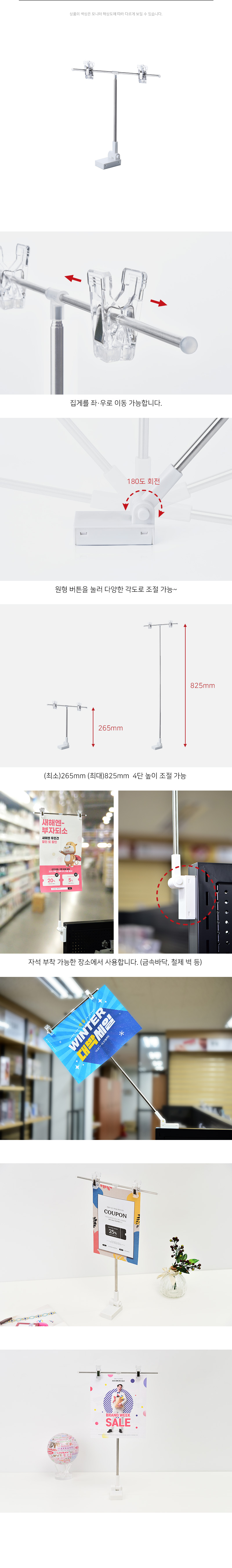 집게의 좌, 우 이동이 가능해 가로, 세로방향의 다양한 게시물을 거치할 수 있습니다.