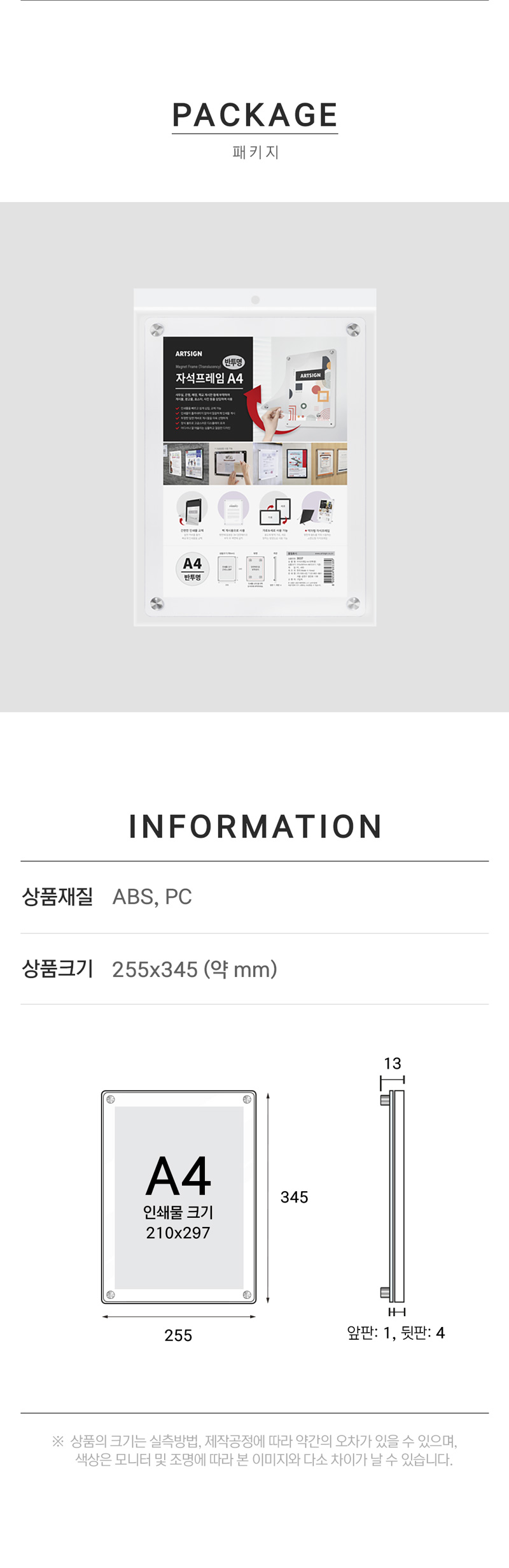 상품크기 외경: 255x345 (mm) 가로x세로, 내경: 210x297 (mm) / 속지크기 기준