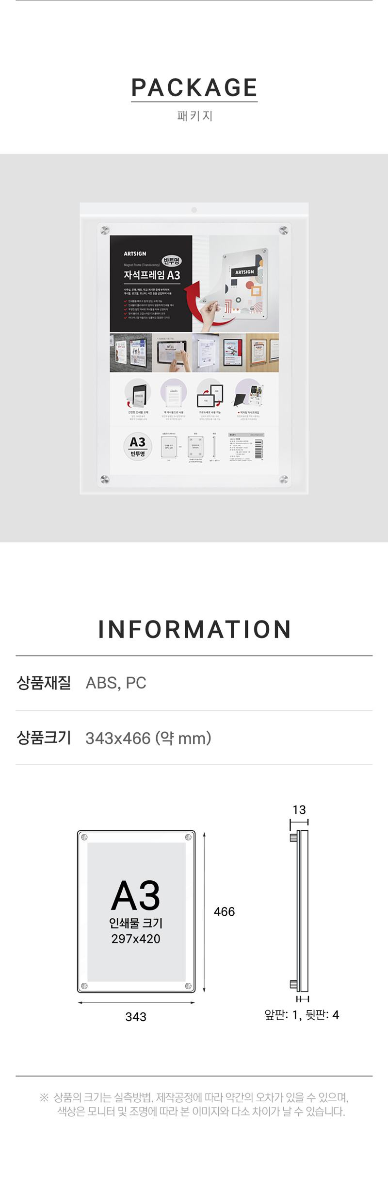 상품크기 외경: 343x466 (mm) 가로x세로, 내경: 297x420 (mm) / 속지크기 기준