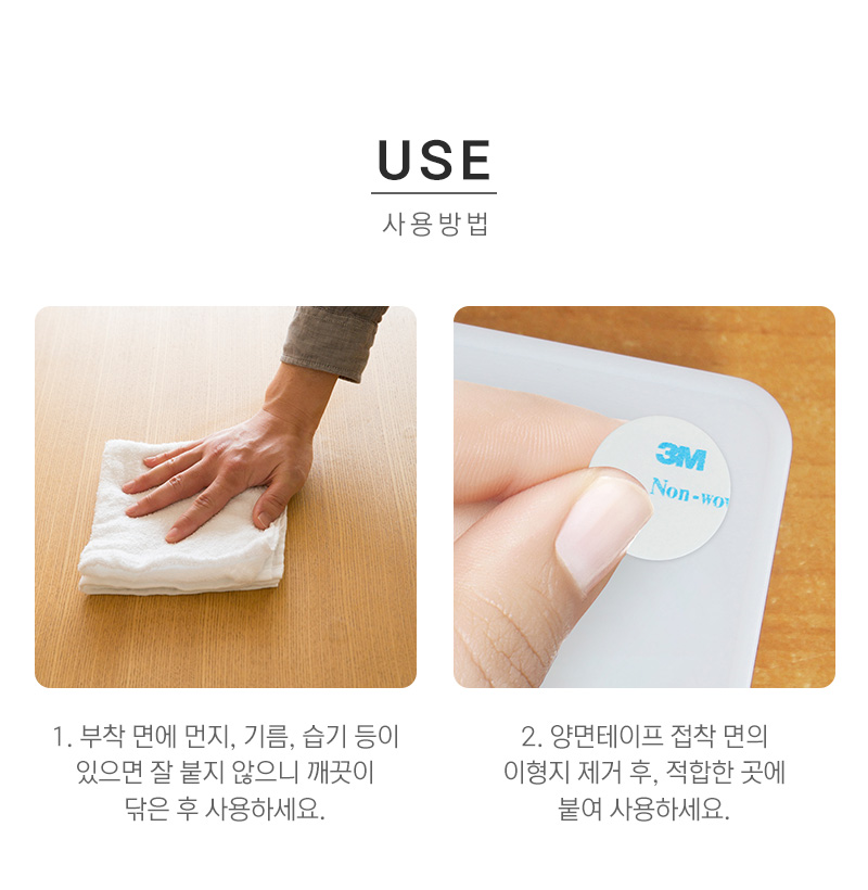 · 사용방법: 양면테이프 접착면의 이형지 제거 후, 적합한 곳에 붙여 사용하세요.