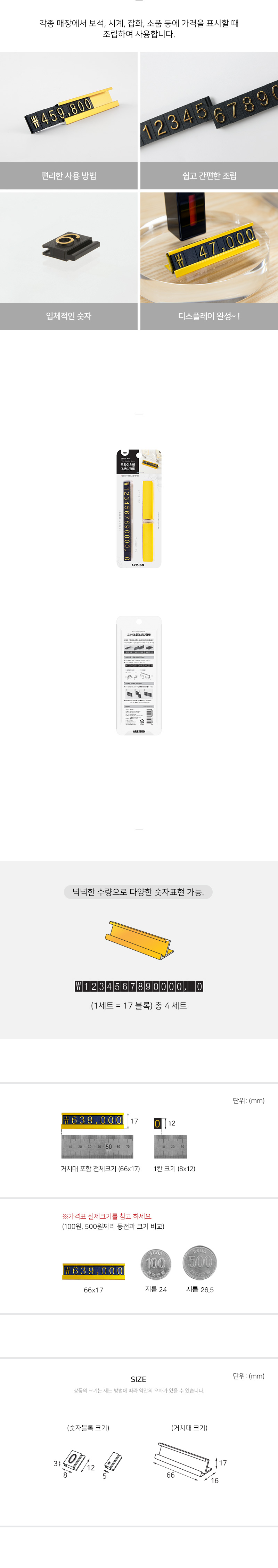 포장단위 4세트 - 거치대 4개입, 숫자블록 4세트 (숫자블록 1세트 구성: 17블록 / 1~9번: 각 1개입 / 0번: 5개입 / ₩,공백,쉼표(,): 각 1개입)