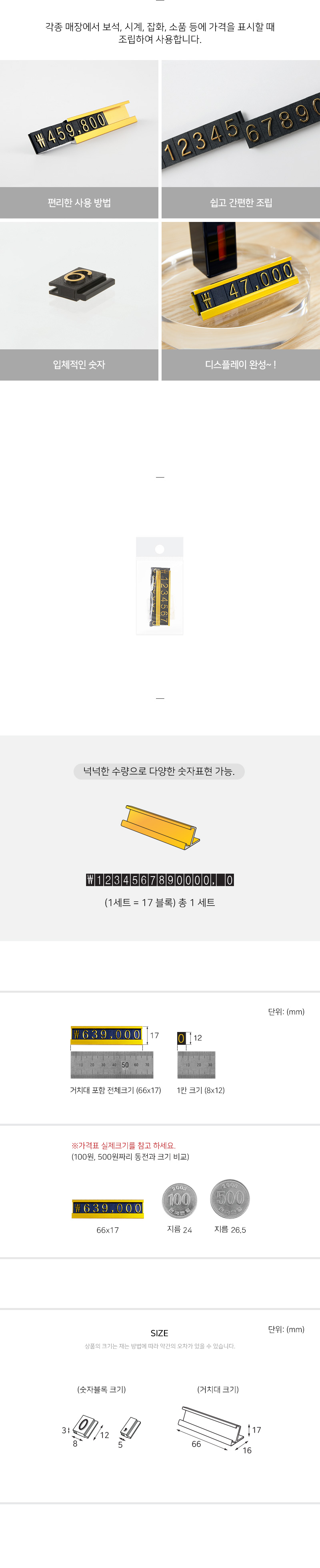 포장단위 1세트 - 거치대 1개입, 숫자블록 1세트 (숫자블록 구성: 17블록 / 1~9번: 각 1개입 / 0번: 5개입 / ₩,공백,쉼표(,): 각 1개입)