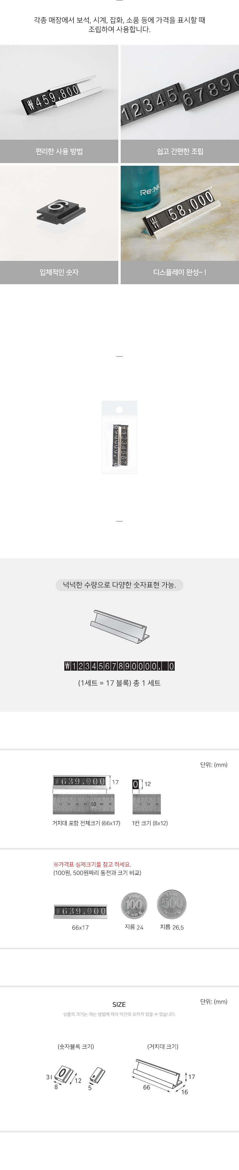 포장단위 1세트 - 거치대 1개입, 숫자블록 1세트 (숫자블록 구성: 17블록 / 1~9번: 각 1개입 / 0번: 5개입 / ₩,공백,쉼표(,): 각 1개입)