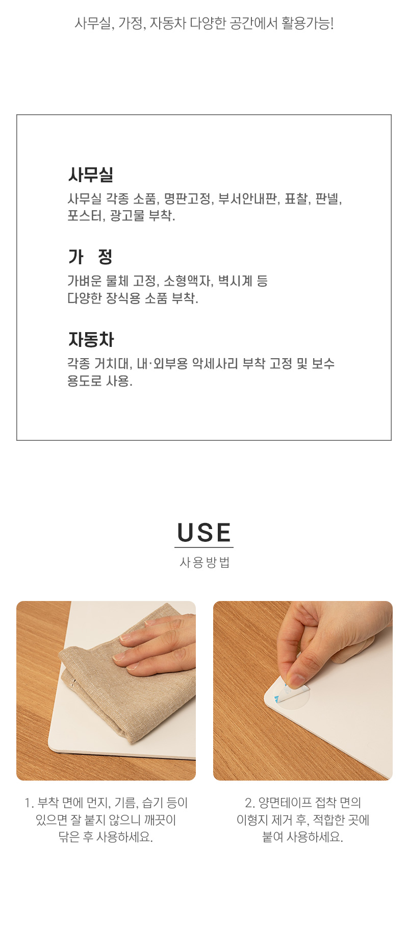 · 사용방법: 양면테이프 접착면의 이형지 제거 후, 적합한 곳에 붙여 사용하세요.