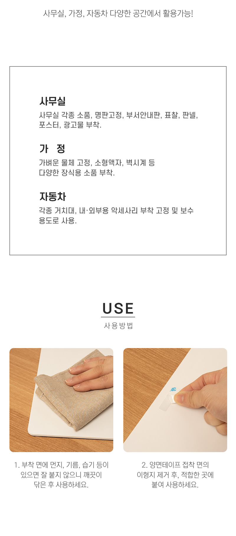 · 사용방법: 양면테이프 접착면의 이형지 제거 후, 적합한 곳에 붙여 사용하세요.