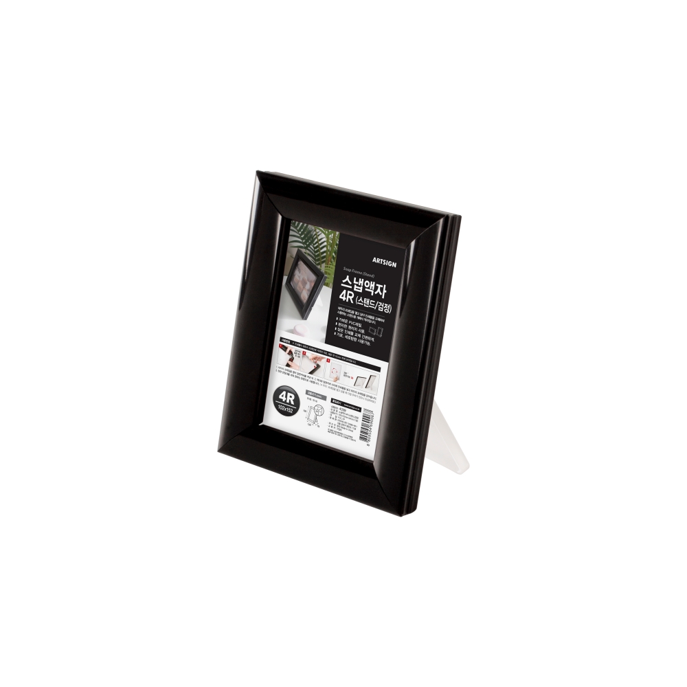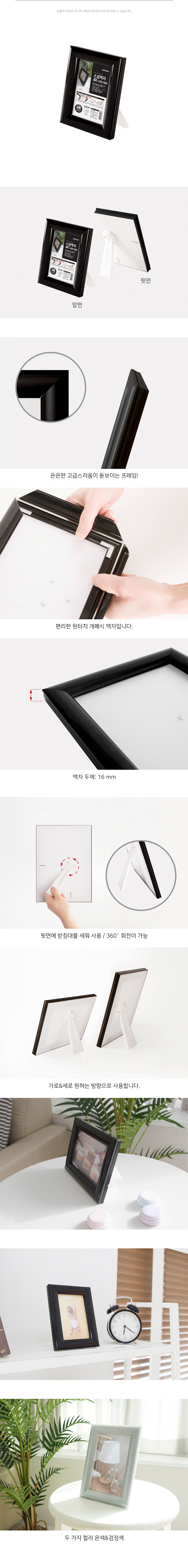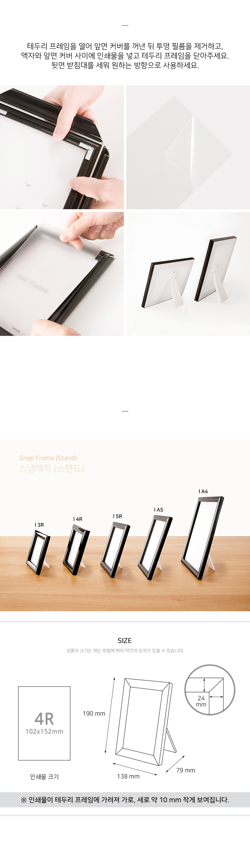 사용방법: 테두리 프레임을 열어 앞면 커버를 꺼낸 뒤, 액자와 앞면 커버 사이에 인쇄물을 넣고 프레임을 닫아 받침대를 세워 사용합니다.