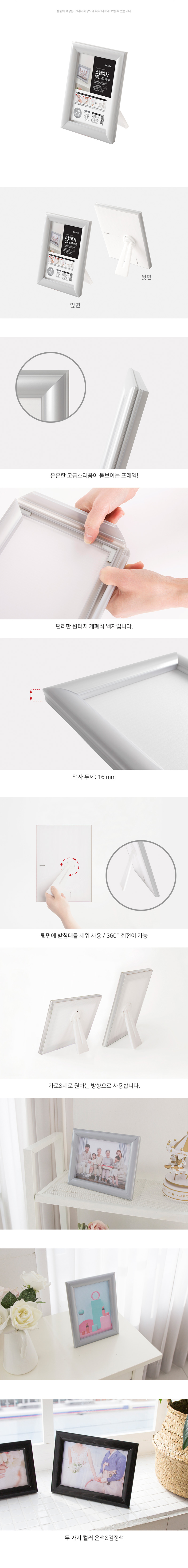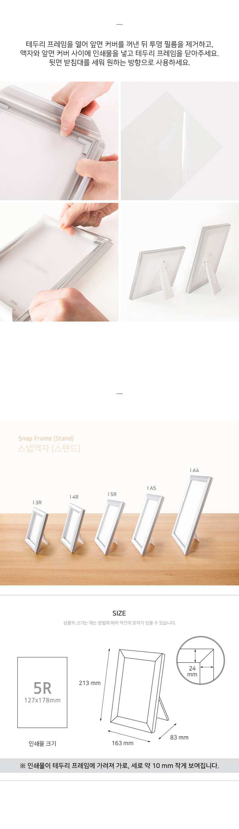 사용방법: 테두리 프레임을 열어 앞면 커버를 꺼낸 뒤, 액자와 앞면 커버 사이에 인쇄물을 넣고 프레임을 닫아 받침대를 세워 사용합니다.