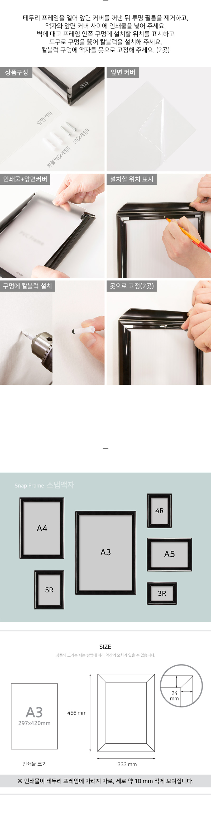 사용방법: 테두리 프레임을 열어 앞면 커버를 꺼낸 뒤, 액자와 앞면 커버 사이에 인쇄물을 넣고