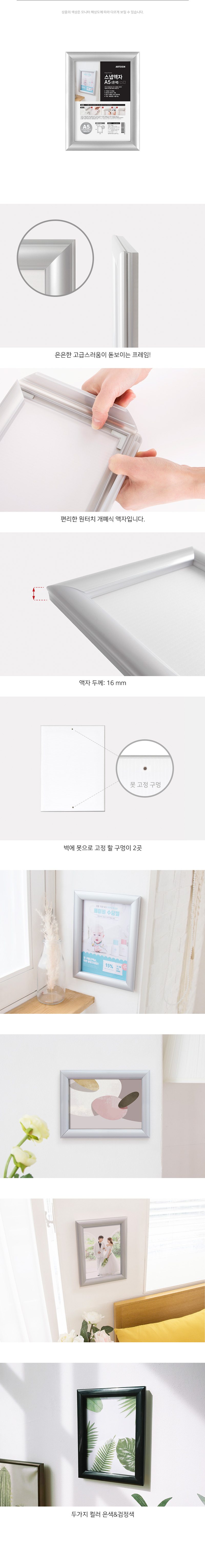 테두리 프레임을 원터치로 열고 닫아 사용하는 벽고정용 개폐식 액자입니다.