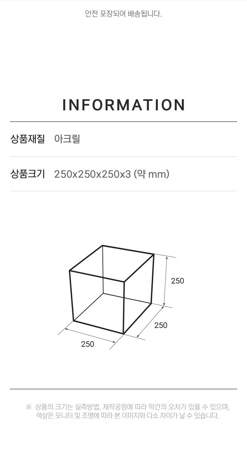 상품크기 250x250x250x3 (mm) 가로x세로x높이x두께