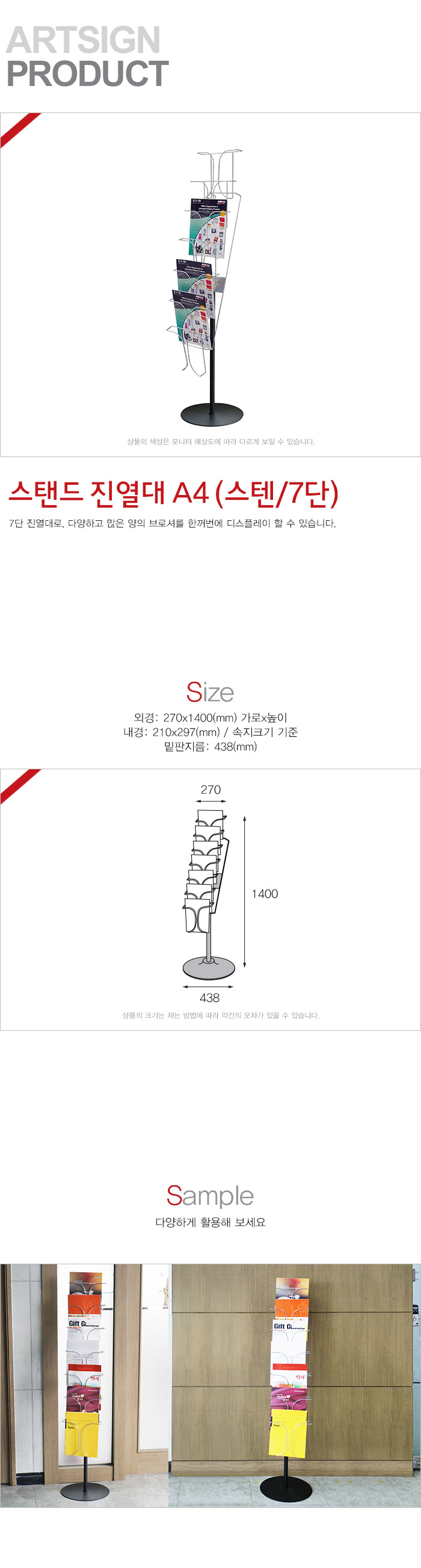 상품크기 외경: 270x1400 (mm) 가로x높이, 내경: 210x297 (mm) / 속지크기 기준, 밑판지름: 438 (mm)