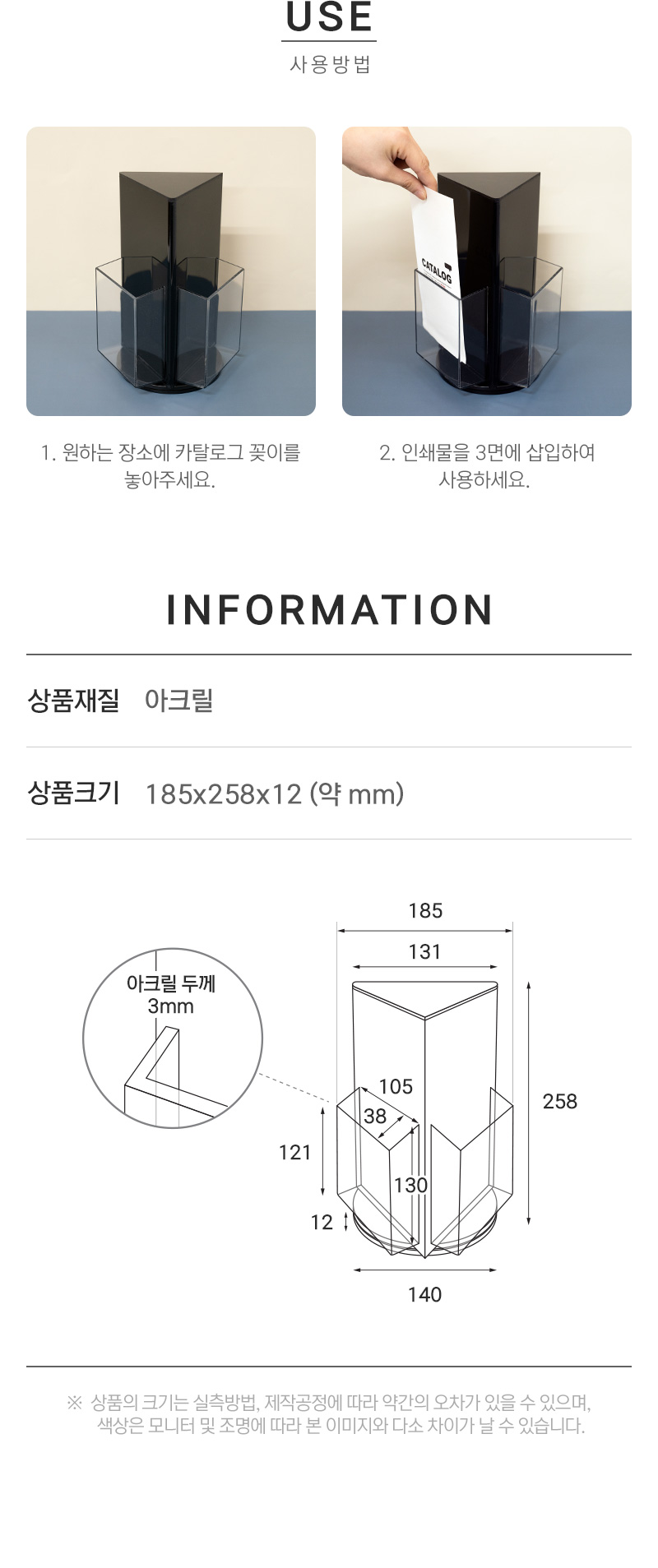 ※ 비포장 상품입니다. · 사용방법: 원하는 장소에 놓고 A4 크기의 인쇄물을 3면에 삽입하여 사용하세요. |