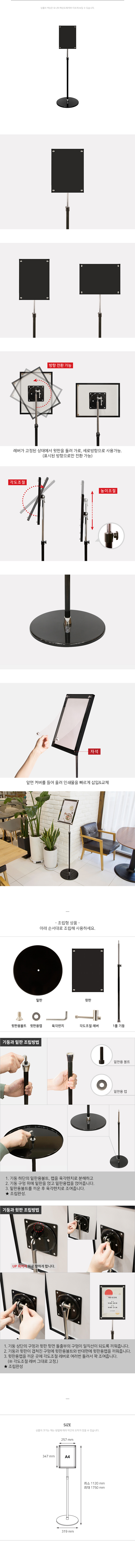 사용방법: 아래 상세 이미지를 참고해 조립한 뒤, 원하는 장소에 세워놓고 A4 크기의 인쇄물을 넣고 사용하세요.