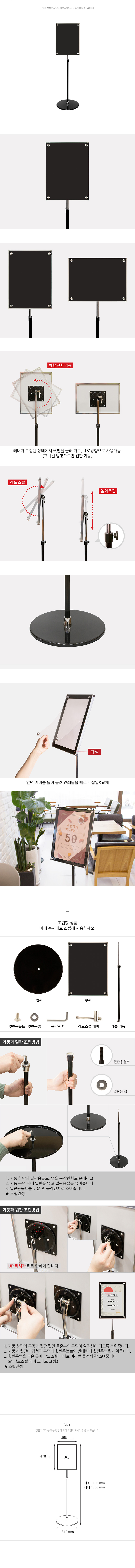 사용방법: 아래 상세 이미지를 참고해 조립한 뒤, 원하는 장소에 세워놓고 A3 크기의 인쇄물을 넣고 사용하세요.