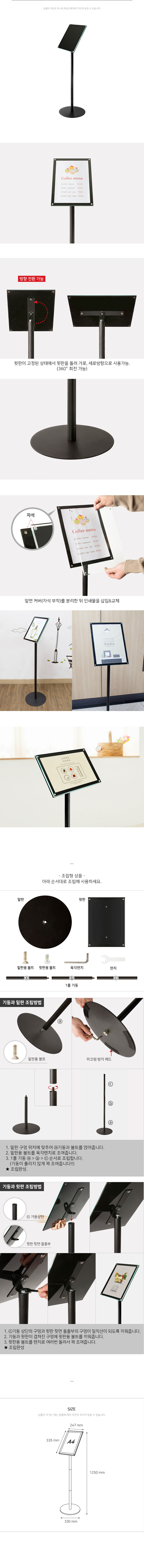 사용방법: 아래 상세 이미지를 참고해 조립한 뒤, 원하는 장소에 세워놓고 A4 크기의 인쇄물을 넣고 사용하세요.