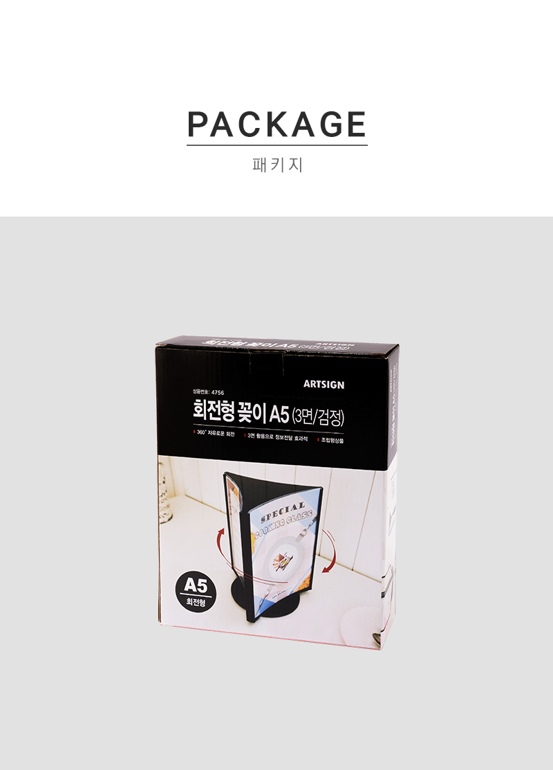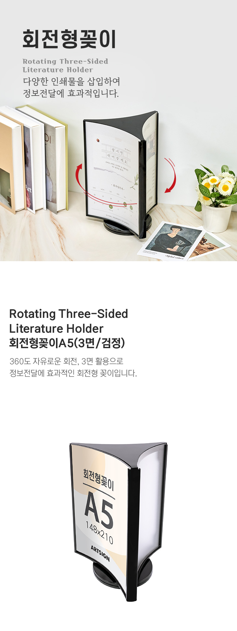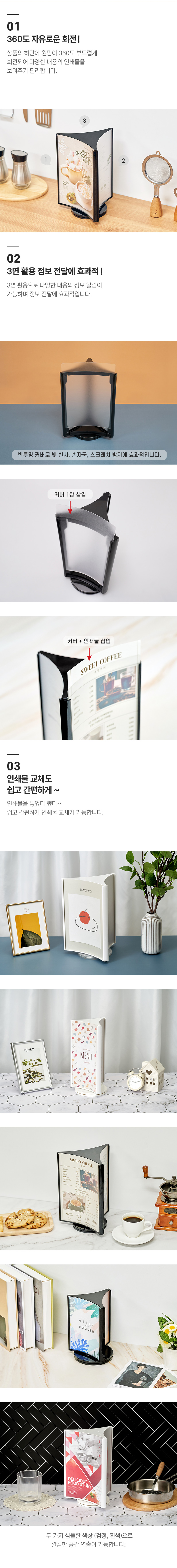 360도 자유로운 회전, 3면 활용으로 정보전달에 · 사용방법: 원하는 장소에 놓고 A5 크기의 인쇄물을 3면에 삽입하여 사용하세요. |
