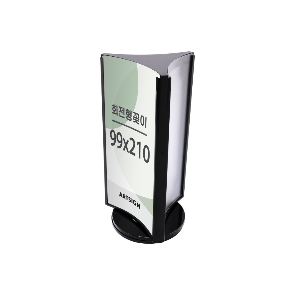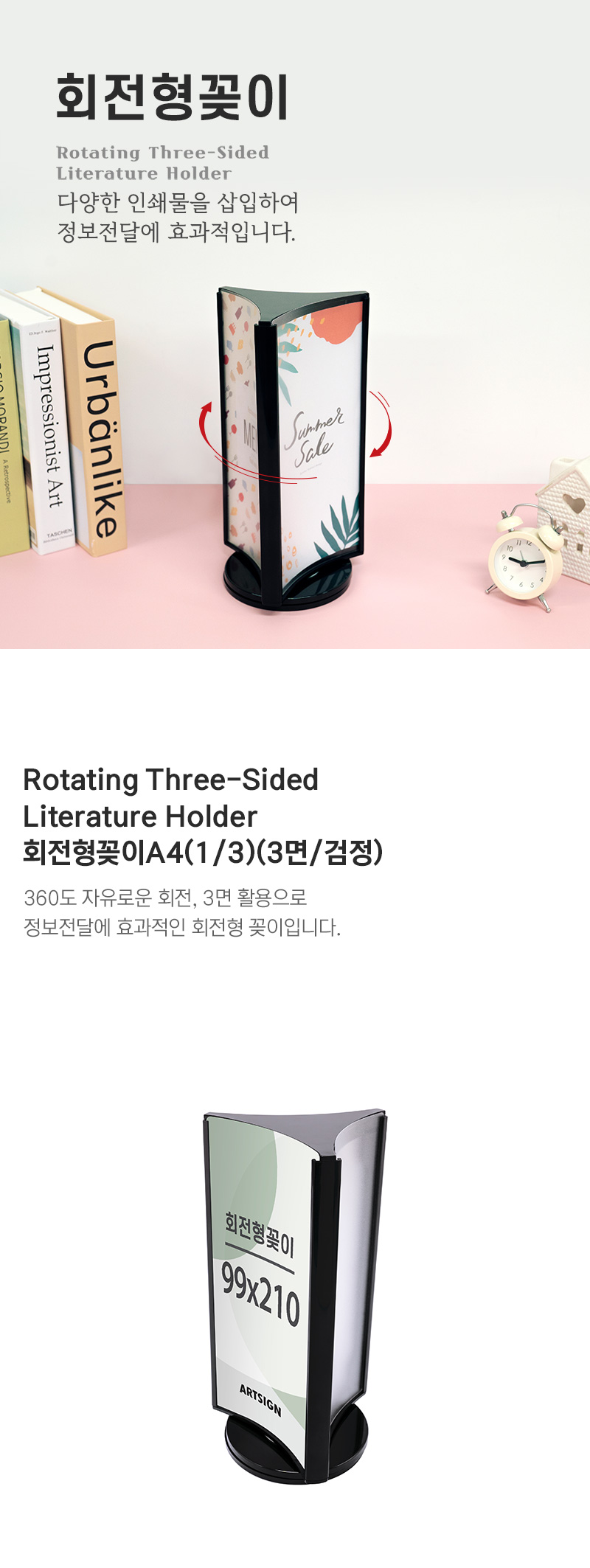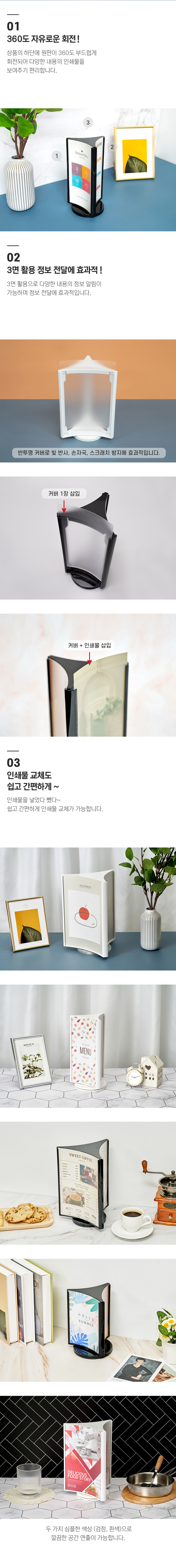 360도 자유로운 회전, 3면 활용으로 정보전달에 · 사용방법: 원하는 장소에 놓고 99x210(mm) 크기의 인쇄물을 3면에 삽입하여 사용하세요. |