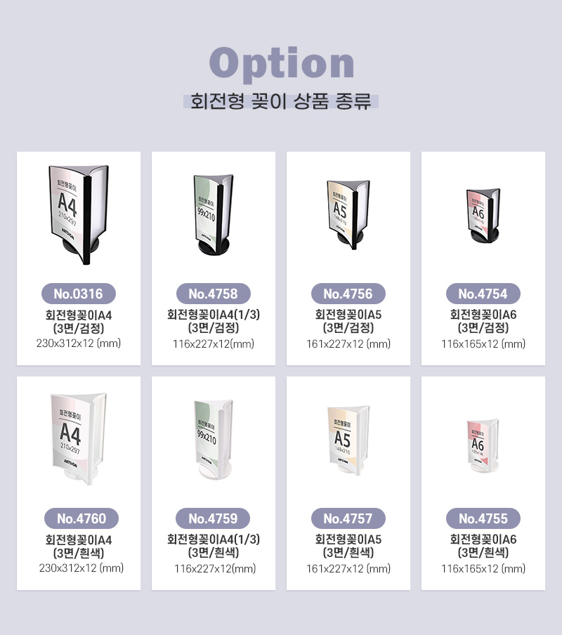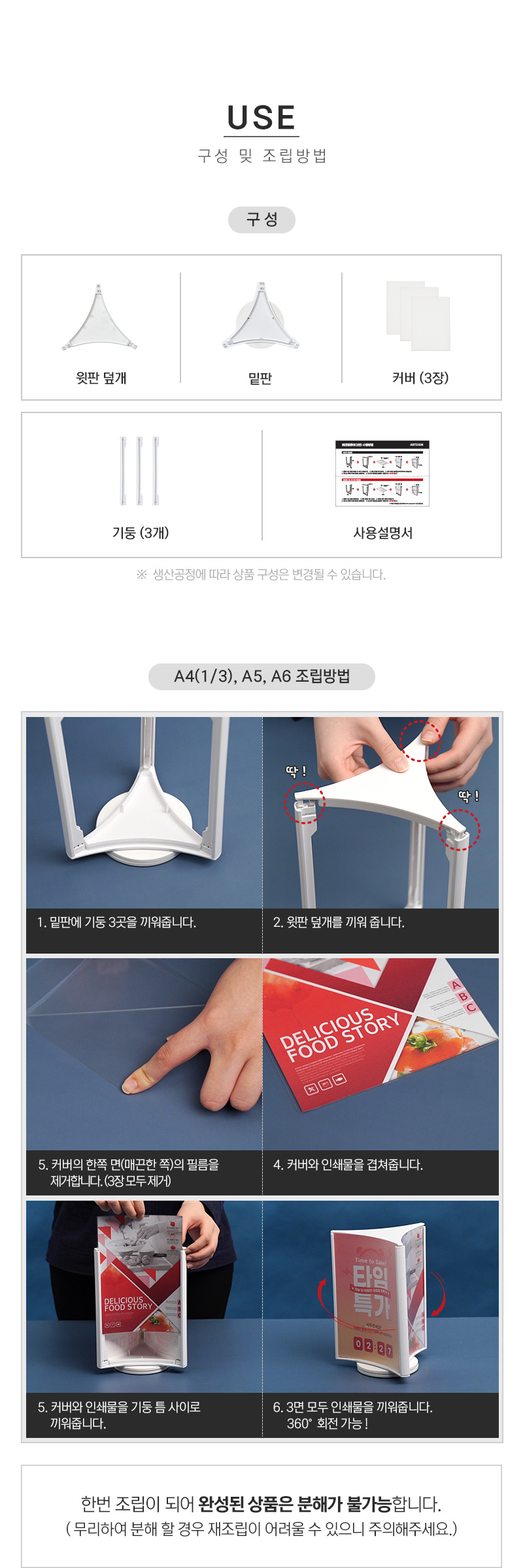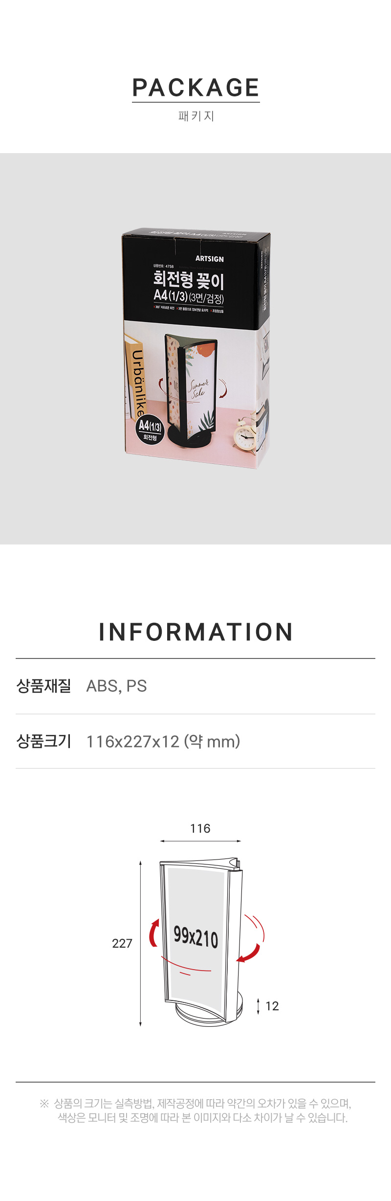 360도 자유로운 회전, 3면 활용으로 정보전달에 · 사용방법: 원하는 장소에 놓고 99x210(mm) 크기의 인쇄물을 3면에 삽입하여 사용하세요. |