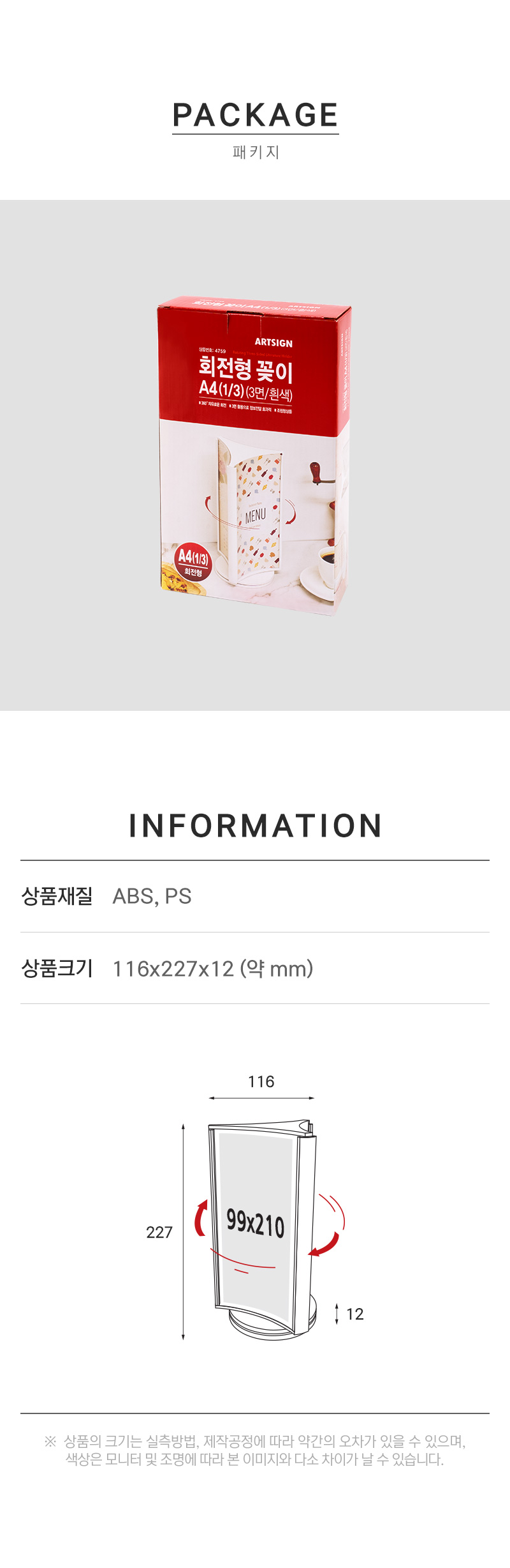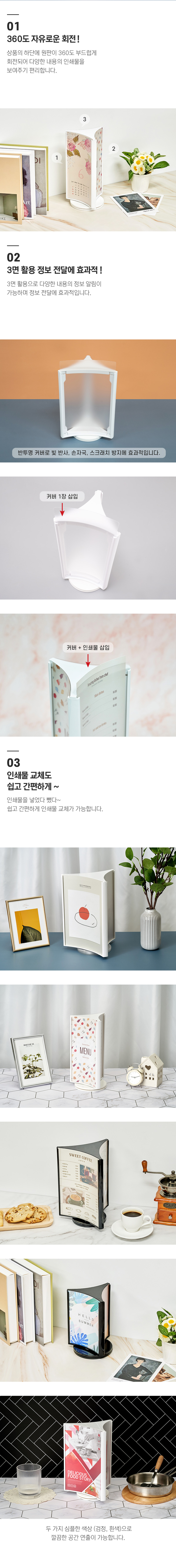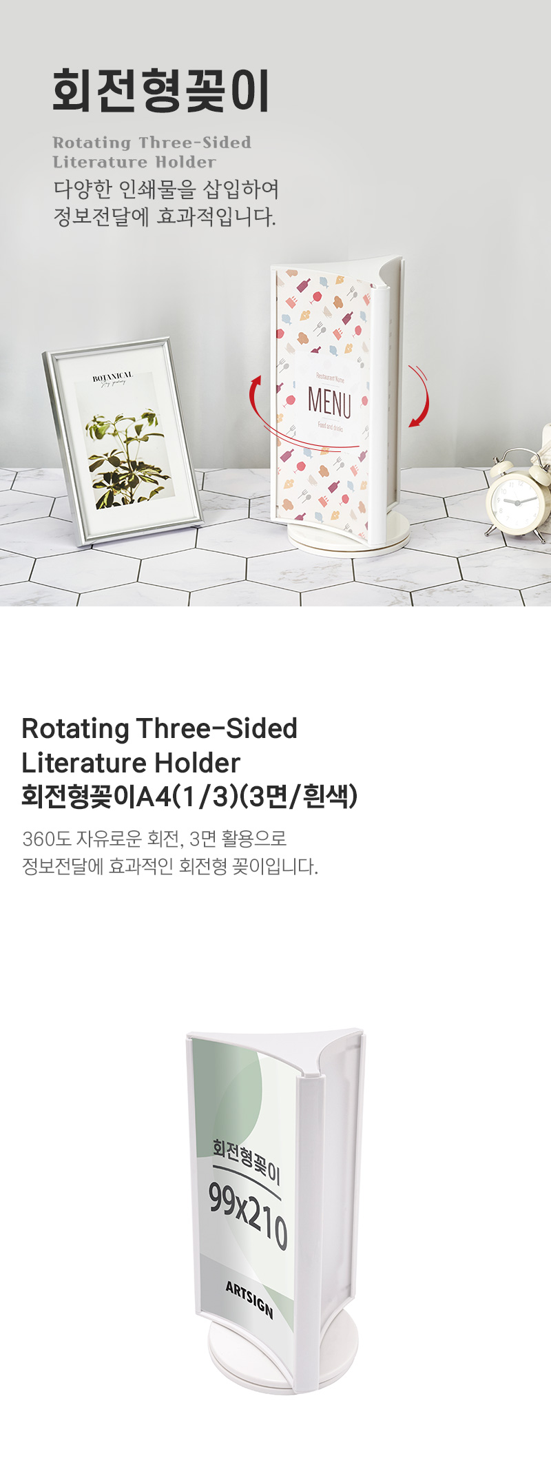 · 사용방법: 원하는 장소에 놓고 99x210(mm) 크기의 인쇄물을 3면에 삽입하여 사용하세요.