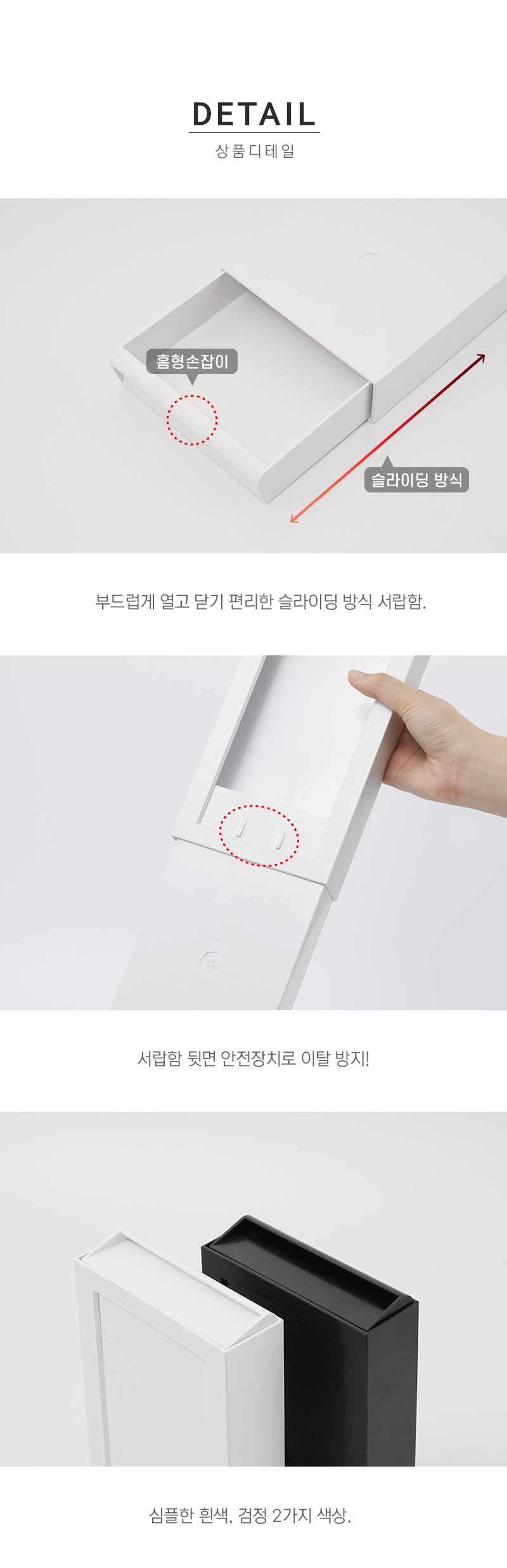 부드럽게 열고 닫기 편리한 부착식 슬라이딩 서랍함.