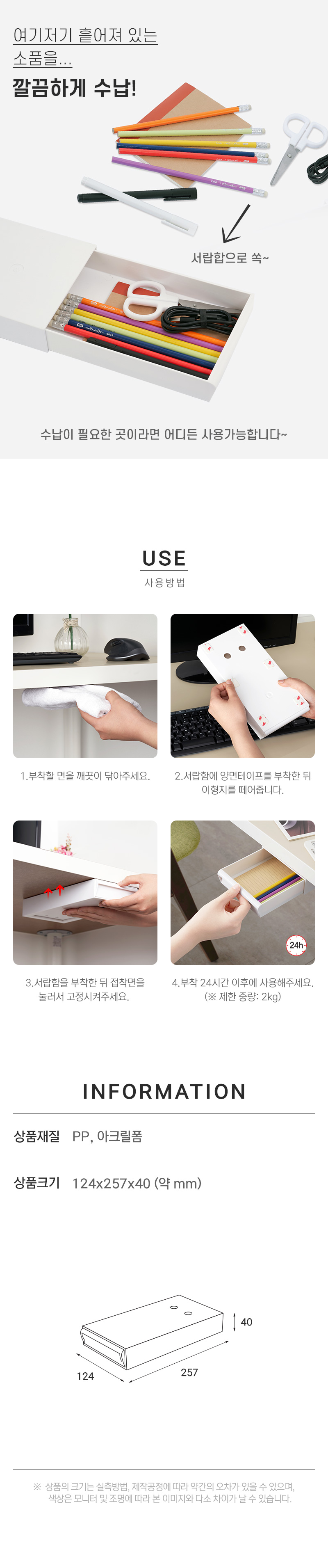 · 사용방법: 서랍함에 양면테이프를 부착한 뒤 이형지를 떼어 원하는 공간에 부착하여 사용합니다.