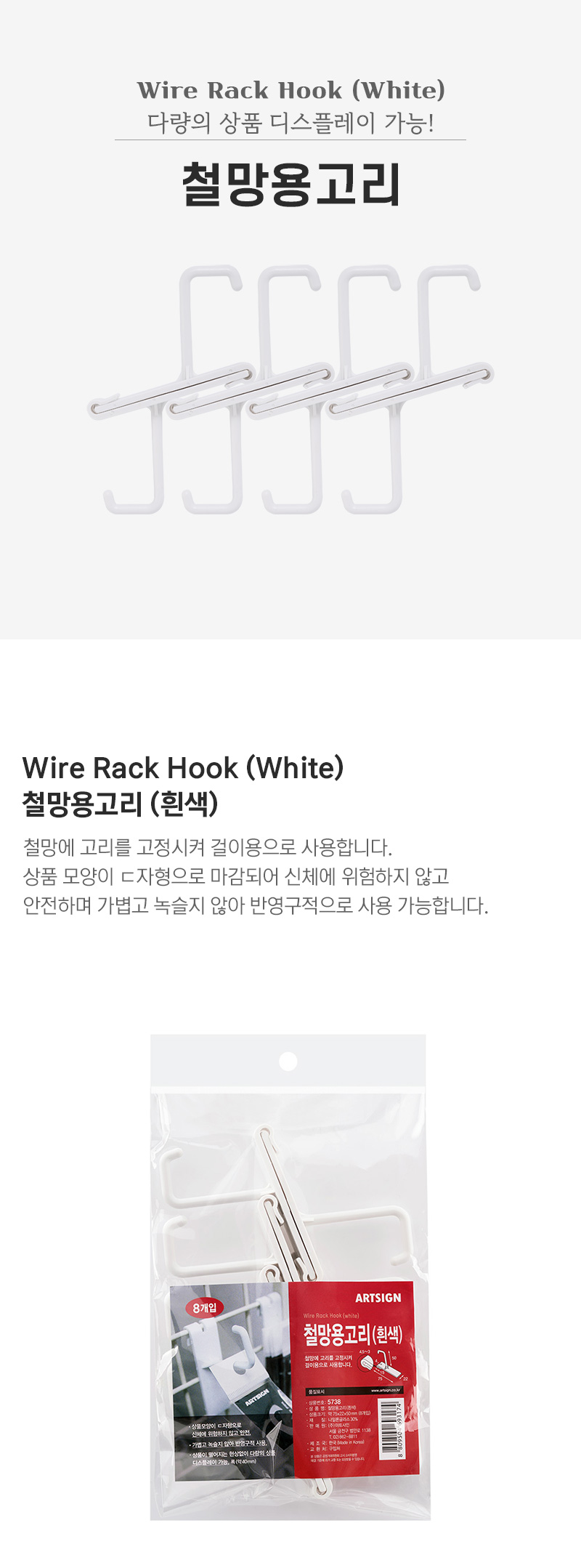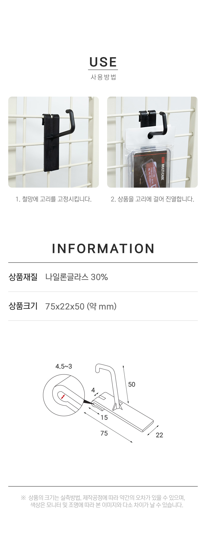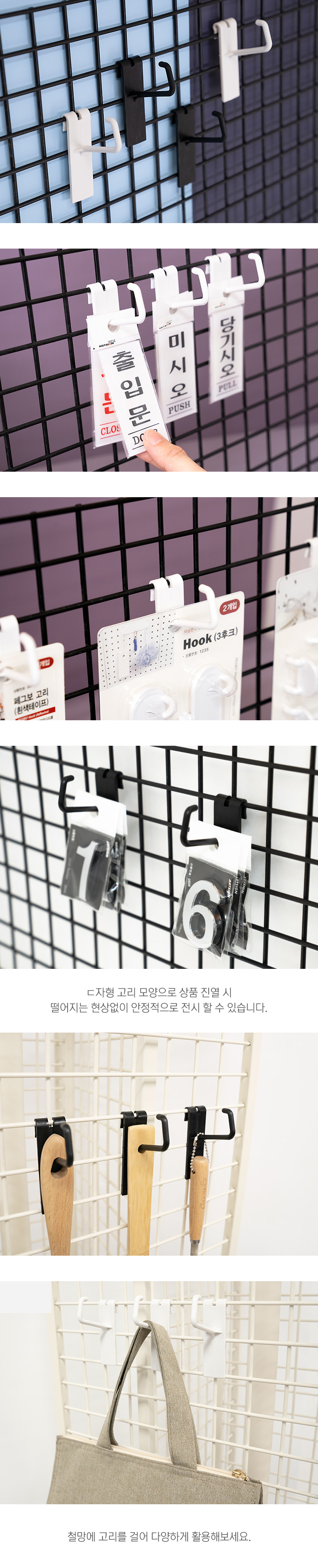 철망에 고리를 고정시켜 걸이용으로 사용합니다. · 사용방법: 철망에 고리를 고정시킨 후 상품을 고리에 걸어 진열합니다. |