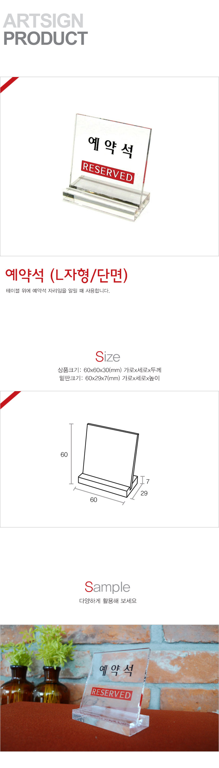 상품크기 60x60x3 (mm) 가로x세로x두께, 60x29x7 (mm) / 밑판크기