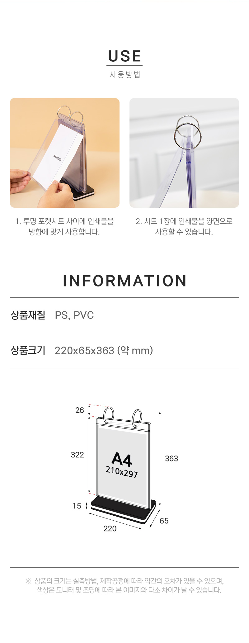 상품크기 외경: 약220x65x363(mm) 가로x세로x높이, 내경: 210x297(mm) 가로x세로 / 속지크기 기준