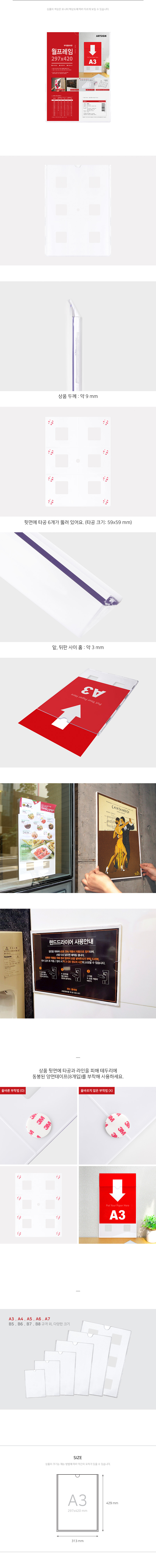 사용방법: 뒷면의 타공, 라인을 피해 양면테이프(8개입)를 붙이고, 원하는 곳에 부착한 뒤에 인쇄물을 넣고 사용하세요.