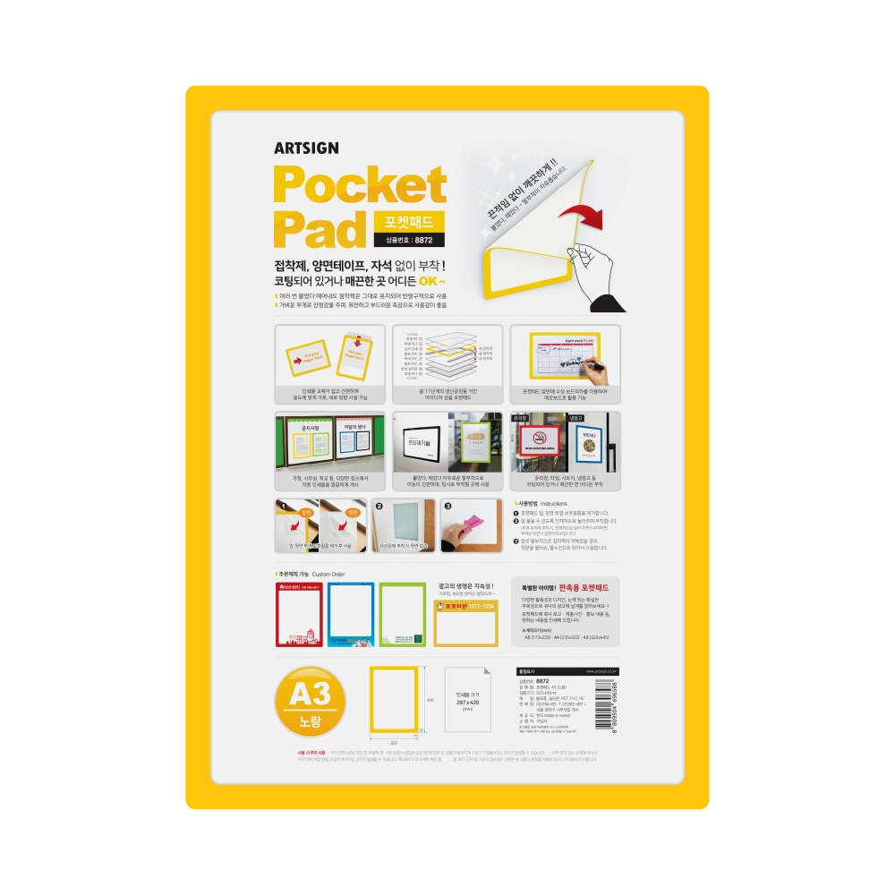 상품번호 8872 소비자가격 19,500원 판매가격 13,650원 상품크기 외경: 322x445 (mm) 가로x세로, 내경: 297x420 (mm) / 속지크기 기준 상품재질 발포폼, 실리콘, PET, PVC, PE 제조사 판매원: (주)아트사인 제조국 KOREA 포장단위 1개입 배송방법 택배 배송비 3,000원(50,000원 이상 무료배송) 주문제작 주문제작하기 상품공유 URL 복사