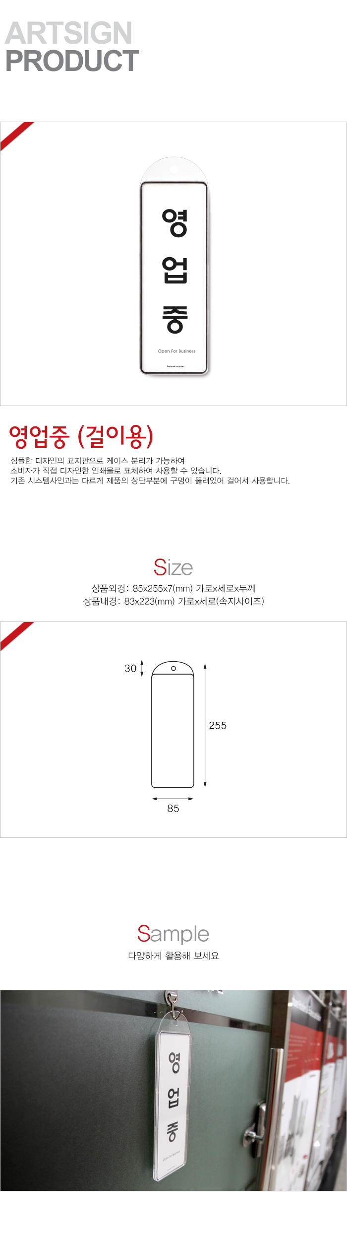 상품크기 외경: 85x255x7 (mm) 가로x세로x두께, 내경: 83x223(mm) / 속지크기 기준