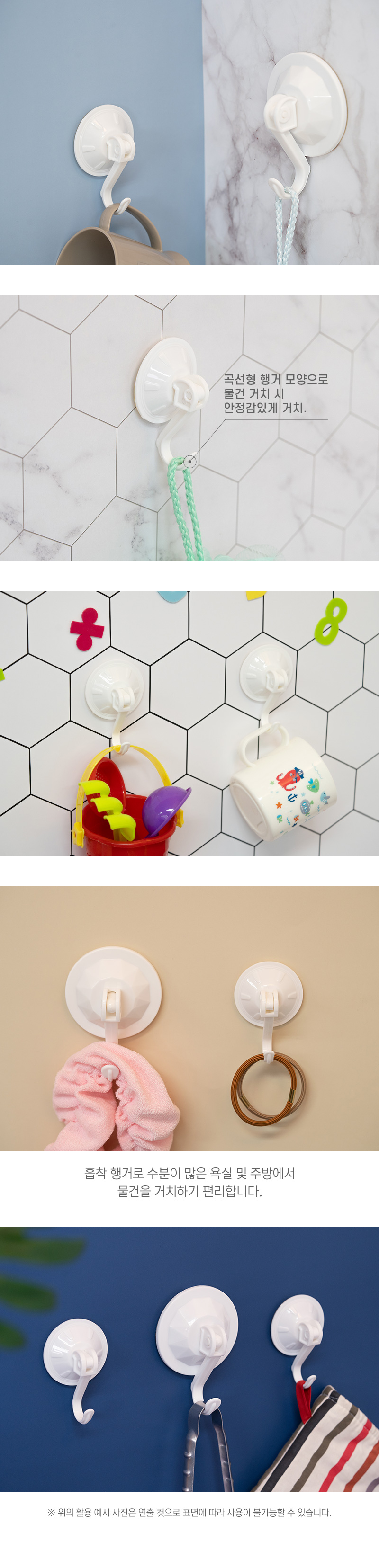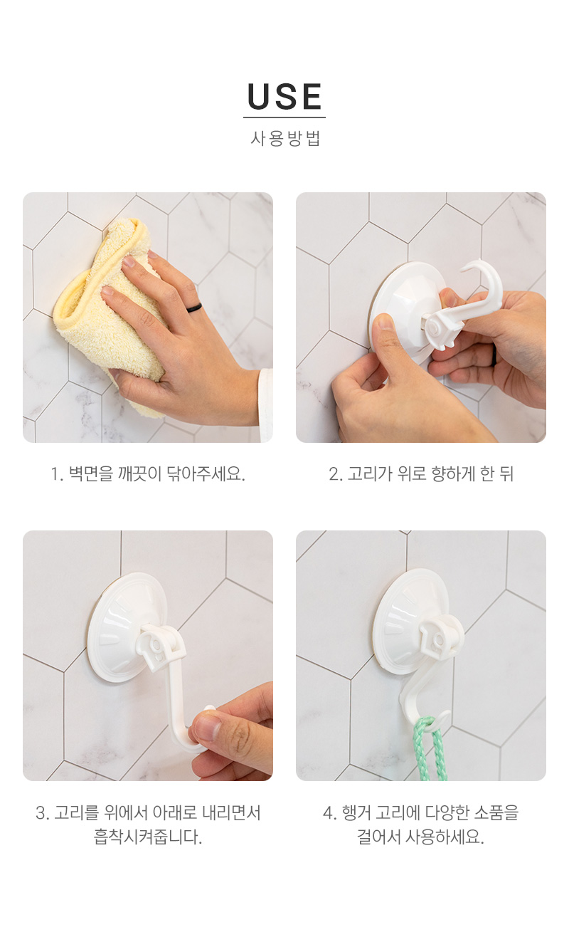 타일, 유리, 스틸 등 매끈한 면에 흡착시켜 걸이용으로 사용합니다.